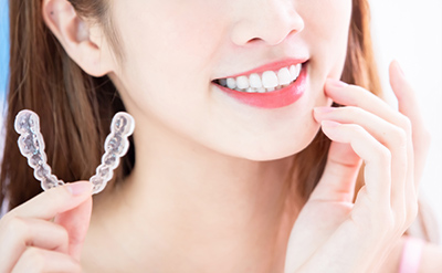 マウスピース型の装置を口腔内に装着し、歯並びを整える方法はマウスピース矯正と呼ばれます。当院で用いるインビザラインは、世界的に豊富な症例実績を持つブランドです。装着するマウスピースは無色透明の樹脂で作られており、周囲から気づかれにくいため見た目を気にされるかたにも適した方法です。