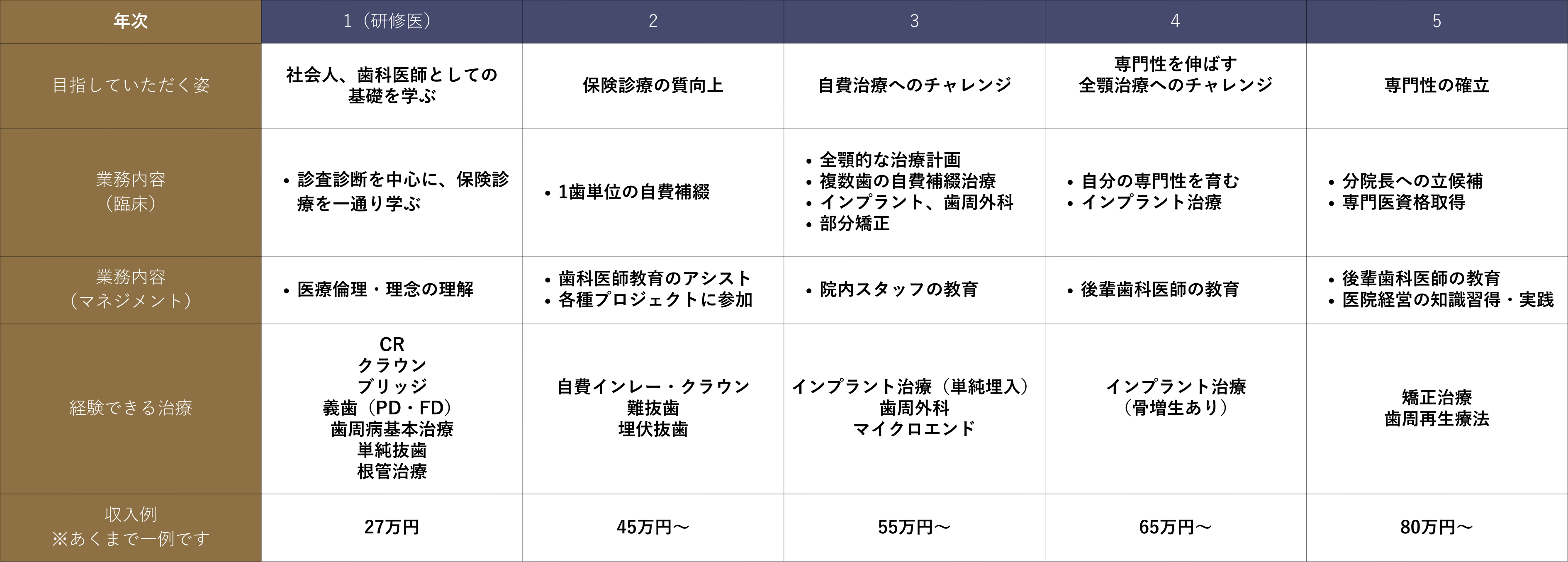 | その他 | 希望する者は以下の処遇にて2年目は常勤歯科医師として採用可。 2年目勤務医処遇: 月額 450,000円 その他の処遇条件については、1年目研修と準ずるものとする。 ただし、労働基準等法令に伴う要件に対しては、法に準ずるものとする。 |